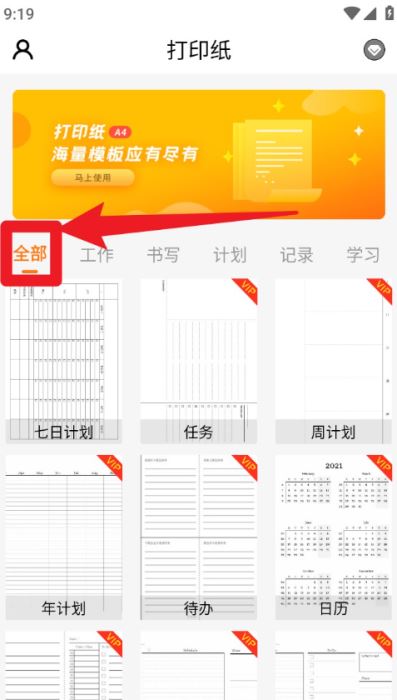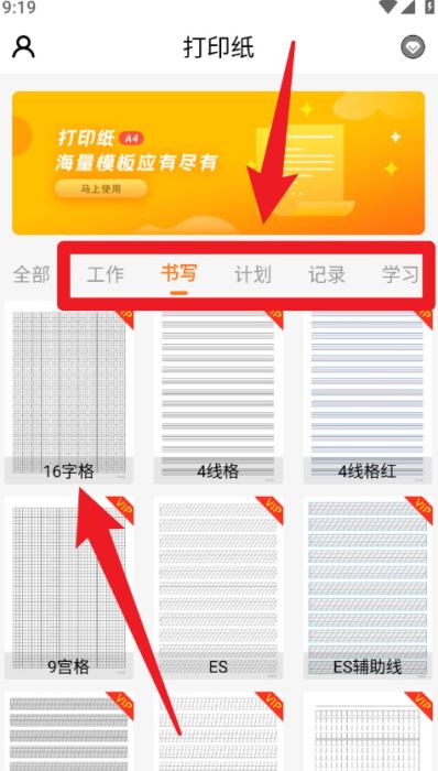 打开打印纸App,点击首页的横幅即可进入模板分类页面。这里海量模板尽收眼底,支持按照“工作”“书写”等类型进行切换查看。