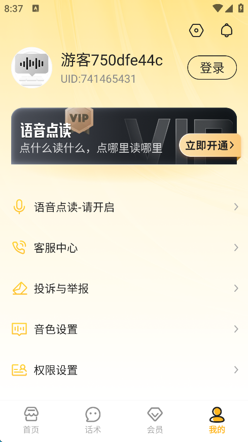点击【我的】进入个人中心,当前显示游客状态时,点击右上角【登录】按钮,通过手机号注册即可完成账号登录。