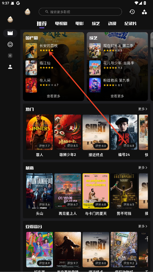 在首页浏览热门影视内容,应用会根据用户兴趣推荐电影、电视剧、动漫等。