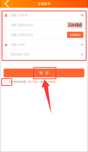依次输入手机号码、验证码及设置密码,勾选同意相关协议后完成注册流程。
