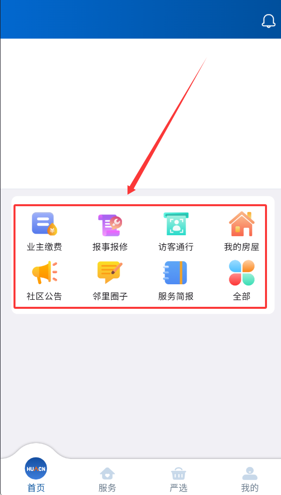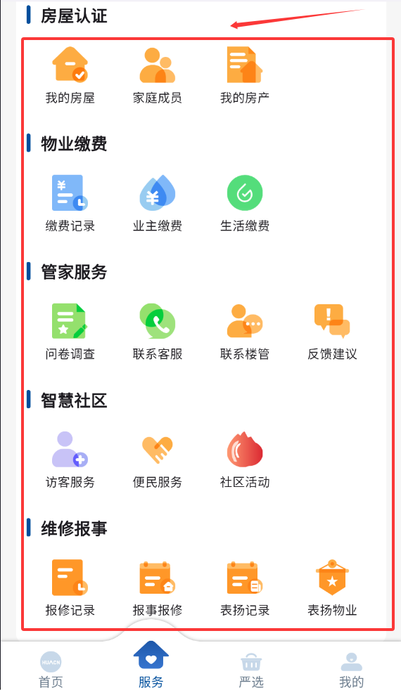 服务板块集中对房屋信息认证、物业费缴纳、联系专属管家、智慧社区服务以及提交维修报事等事项进行管理。