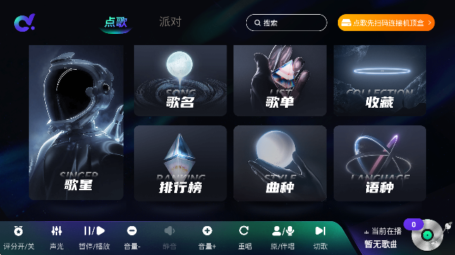 1、点击左上角“点歌”可选择歌名、歌手、曲风、语种等分类快速查找并添加歌曲。