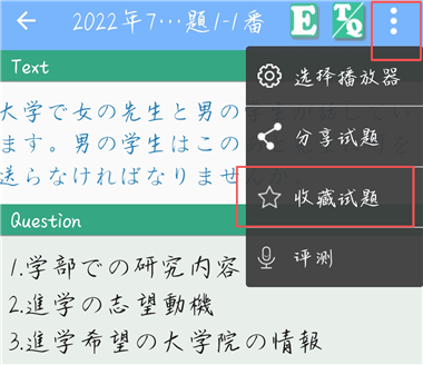 在题目页面中,点击右上角的三点标识,从弹出的选项中选择【收藏试题】。