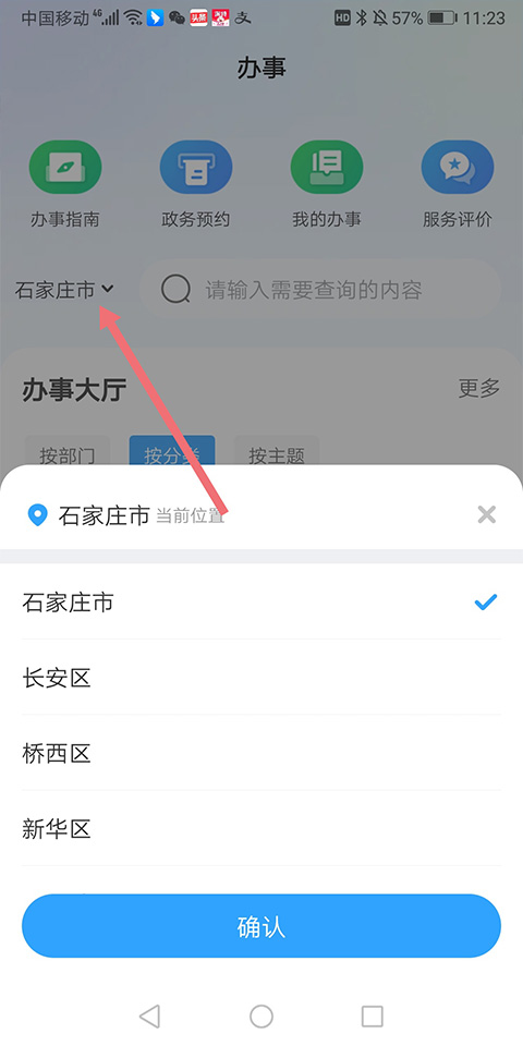 1、用户打开app后进入办事页面中,可以点击搜索框(下图红色箭头所指)