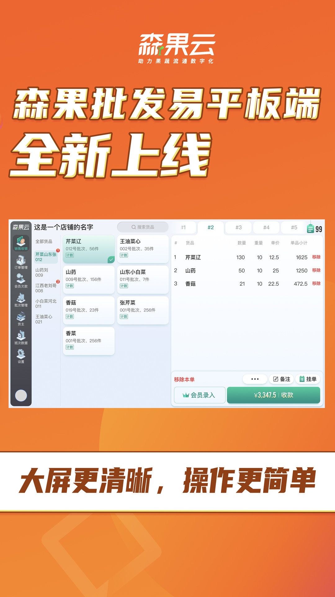 森果批发易平板端是一款专为大屏设备设计的管理软件,主要适用于中小型蔬菜和水果批发商行,支持按批次或车次进行货物销售。软件兼容代卖和自营等多种经营模式,提高批发商的工作效率和管理水平。
