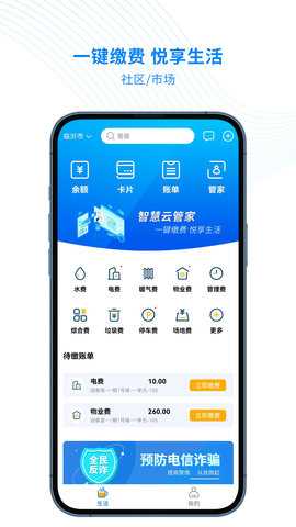 智慧云管家是一款以便民缴费为核心的一站式智慧生活服务平台,利用互联网进行水、电、暖、燃、数字电视、通讯、物业等公共事业缴费和市场园区、医院等机构的租赁、医疗等一系列支付缴费服务。平台致力于提供“安全、便捷、高效、环保”的综合缴费解决方案,支持各种缴费服务项目,助力各行业机构拓展服务渠道,覆盖生活全场景,构建领先的智慧生活生态圈。平台内生活钱包基于中国民生银行Ⅱ类电子专用账户体系打造,该账户仅供用户进行安全、便捷的各类缴费。