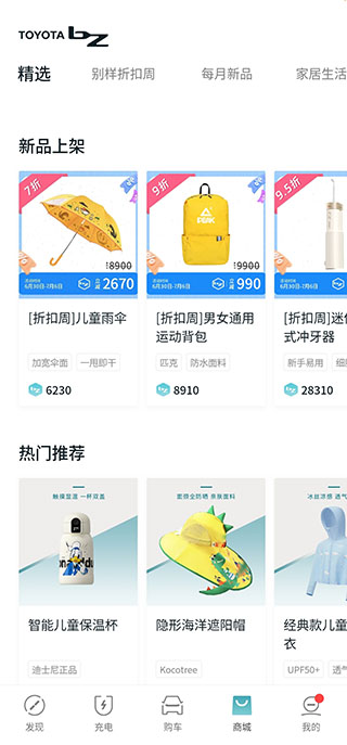 进入“商城”版块,可以选购居家日用、智能数码、运动户外、折扣好物等多种商品,还有专门的车主专享区域。