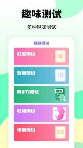 1、全面评估:软件整合了情感智力、MBTI类型、性格特征、社交焦虑症状及智商等多种测试,提供全面的心理评估。