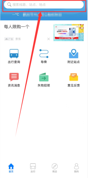首页提供路线、站点及地点检索功能,便于用户快速查询目标位置与交通信息。