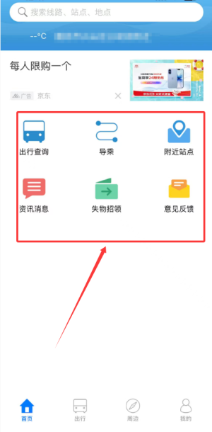 主界面集成了出行方案查询、导乘服务、周边站点定位及失物找寻等功能。