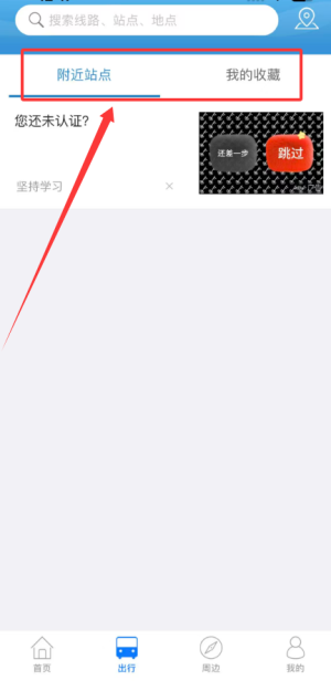 出行板块可查看附近车站位置以及个人收藏的常用路线与地点信息。