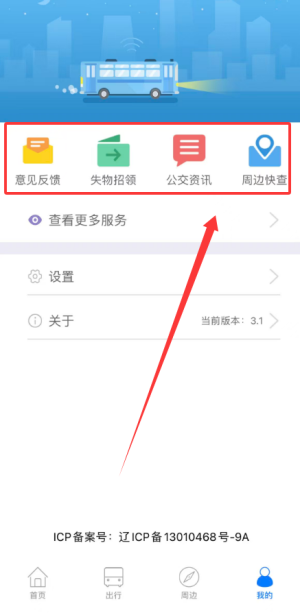 个人中心设有意见提交、失物登记、公交动态及周边设施快捷查询服务。