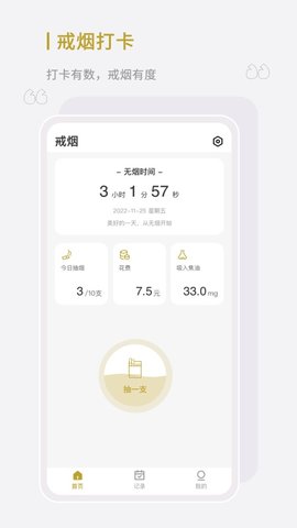 1. 抽烟记录用户可以记录每天的抽烟数量、品牌及价格,形成完整的吸烟档案。