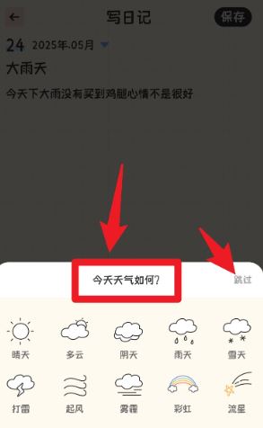 3、写完内容后,页面会弹出天气选择视窗,点选当日天气图标即可同步保存气象信息,也可以选择「跳过」。