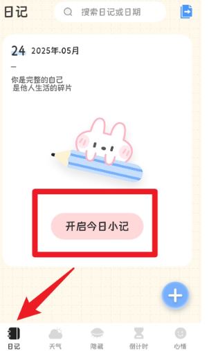 1、进入 App 后点击底部「日记」图标,再点选「开启今日小记」,即可进入当天的日记编辑页面准备记录。