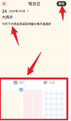 2、输入标题与正文内容,页面底部可切换不同纸张背景,还能选择插入图片或搭配主题,打造个性日记氛围。