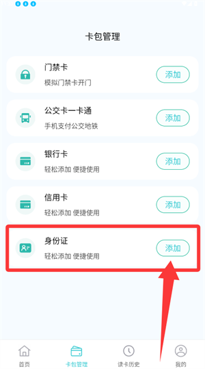 进入卡包页面,点击身份证选项旁边的“添加”按钮,即可进入信息录入页面。