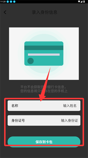 在信息页准确录入姓名和证件号码,确认信息无误后,将其保存到卡包中。