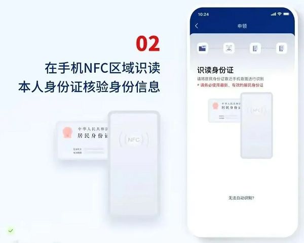 识读本人身份证:将本人身份证放置在手机 NFC 区域,核验身份信息。