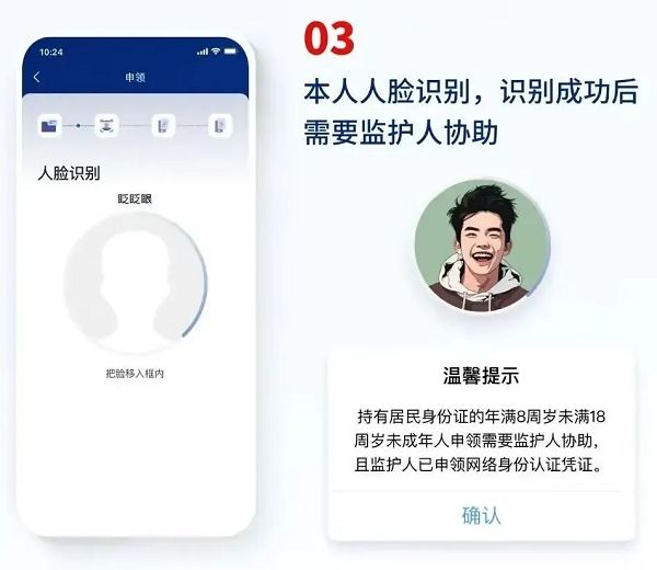 申领需一部支持 NFC 功能的手机,且需已申领网络身份信息的监护人协助