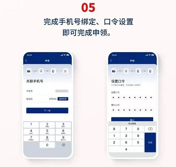 完成绑定与设置:完成手机号绑定、口令设置,即可完成申领。