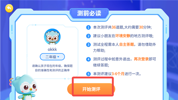 3、填写孩子的姓名和所在年级,然后开始测试。