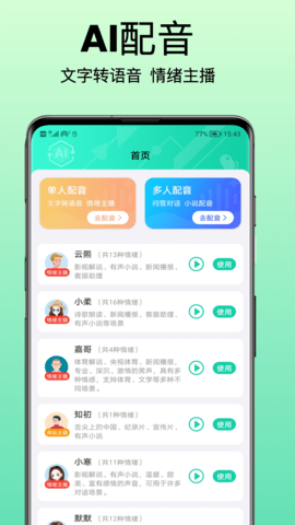 2. 强大的AI配音软件支持多人配音,并提供多款情绪丰富的AI主播,用户可以根据需要选择合适的配音风格,打造个性化的音频作品。