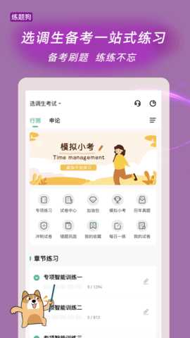 选调生练题狗是一款专为选调生考试考生设计的手机端APP软件,旨在为用户提供全面的题库资源和智能化的学习辅导。该软件汇集了众多经典题型,包含章节练习、历年试卷、预测试卷等功能,帮助考生高效备考,提升考试通过率。