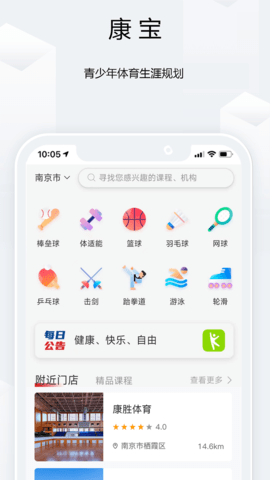 康宝App是一款专为青少年设计的健康管理软件,旨在帮助用户查询体测数据,并根据这些数据推荐适合的运动项目,以提升个人体质和为职业运动发展铺路。康宝App不仅提供体测数据查询功能,还与专业体育运动机构合作,为青少年提供多样化的运动课程,助力他们健康成长。