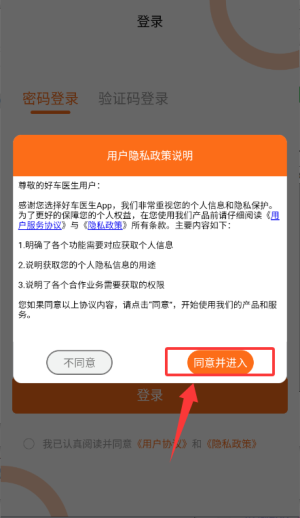 在弹出的用户隐私政策说明窗口中,点击【同意并进入】按钮,即可进入应用主界面。