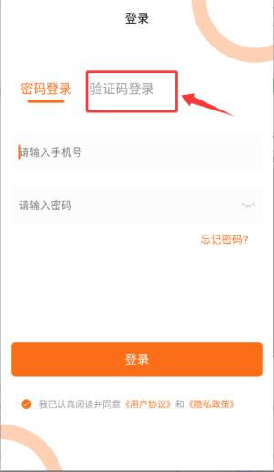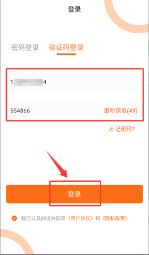 输入手机号码和收到的验证码,勾选用户协议后,点击【登录】按钮完成身份验证。