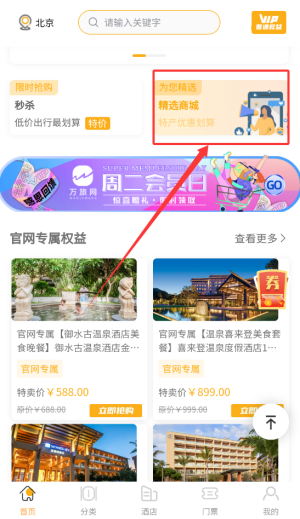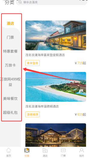 进入分类页面,可查看酒店住宿、景区门票、特惠套餐等多样化服务类型。可根据出行需求快速筛选合适选项,提升预订效率。