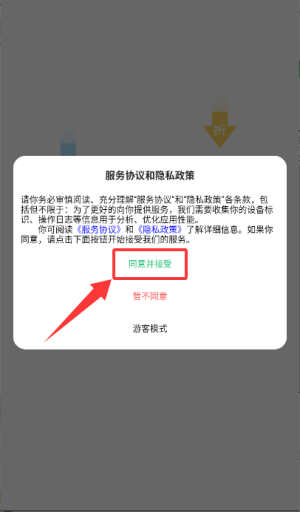 打开后,在弹出的服务协议与隐私政策窗口中点击“同意并接受”按钮,确认相关条款。