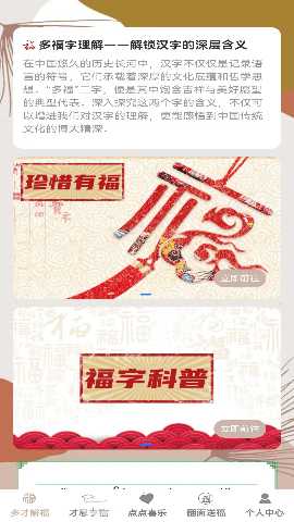 3. 探索福字文化:在主界面选择福字文化模块,浏览相关文章和视频,了解福字的历史与意义。