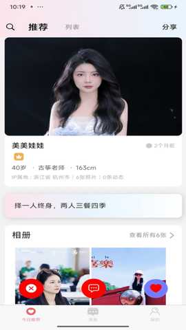 完成注册后,根据自己的兴趣爱好设置匹配条件,系统将为用户推荐合适的对象,用户可查看对方的资料。