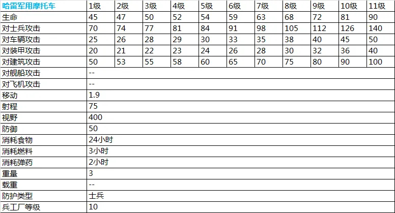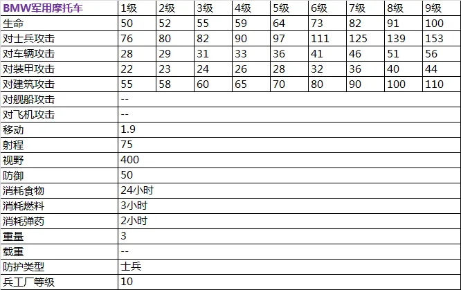 两款摩托车与步枪对比之下的优势是:视野更广,移速更快,战斗力略高一些,劣势也比较明显,造价更为昂贵,需要消耗钢铁和橡胶资源,可以根据不同需求选择~