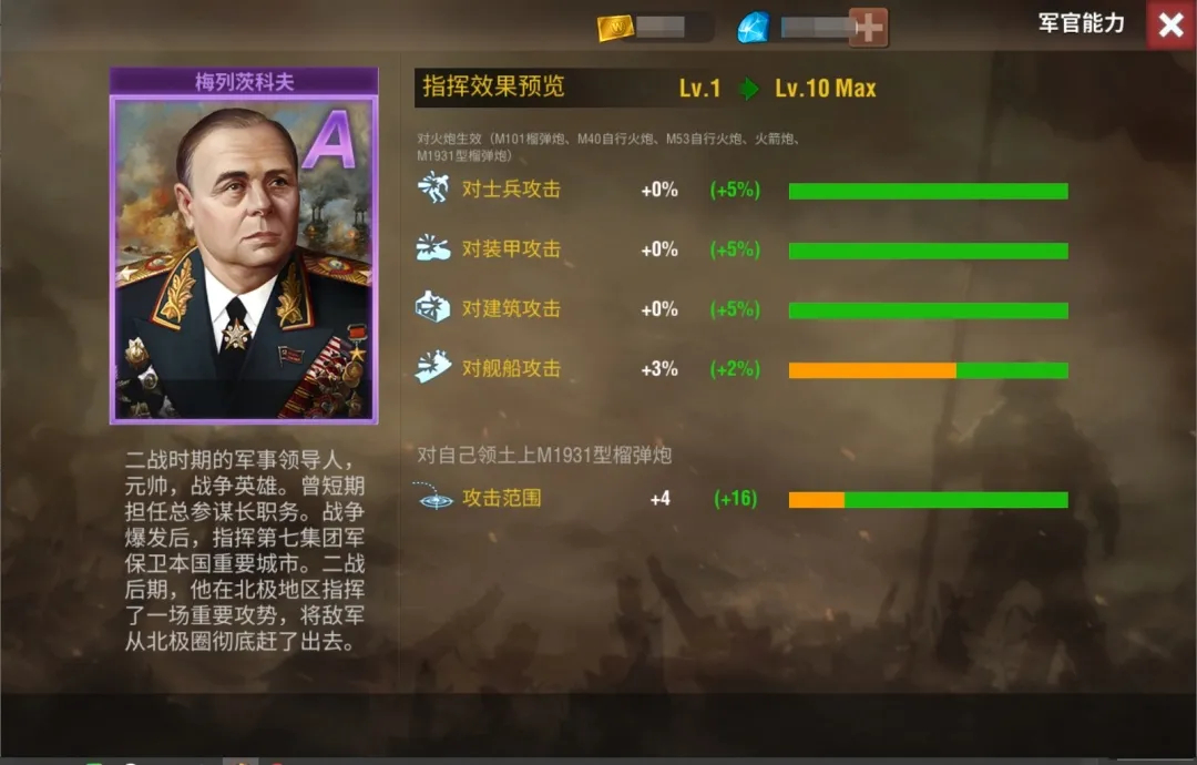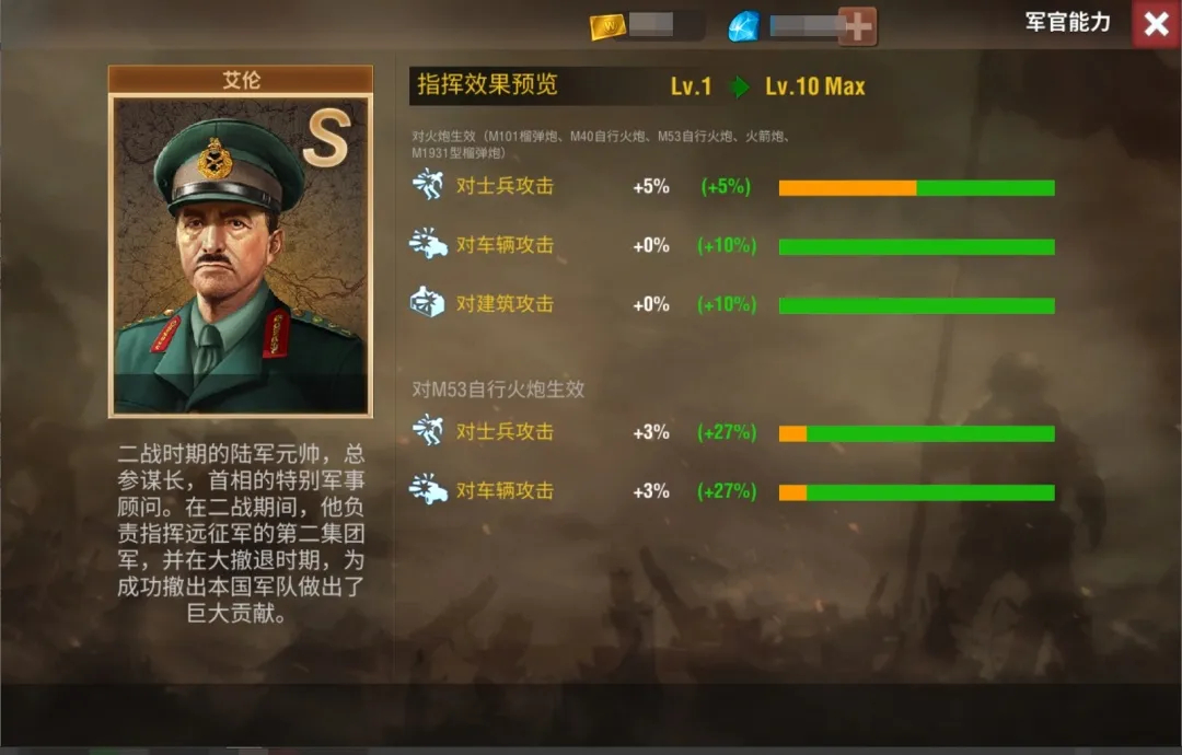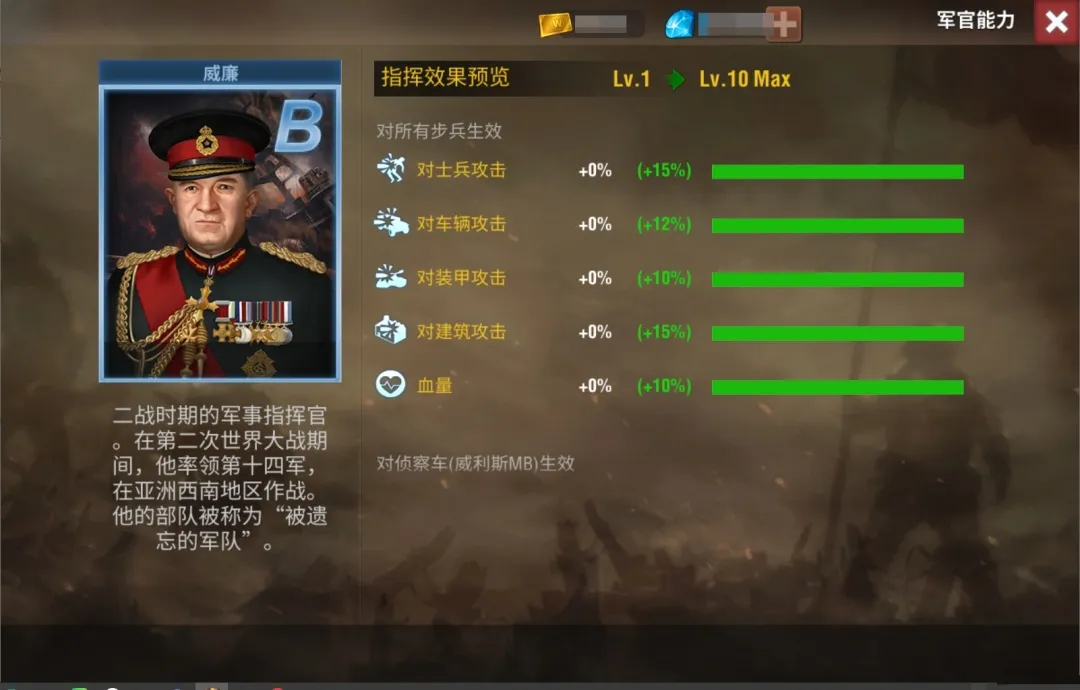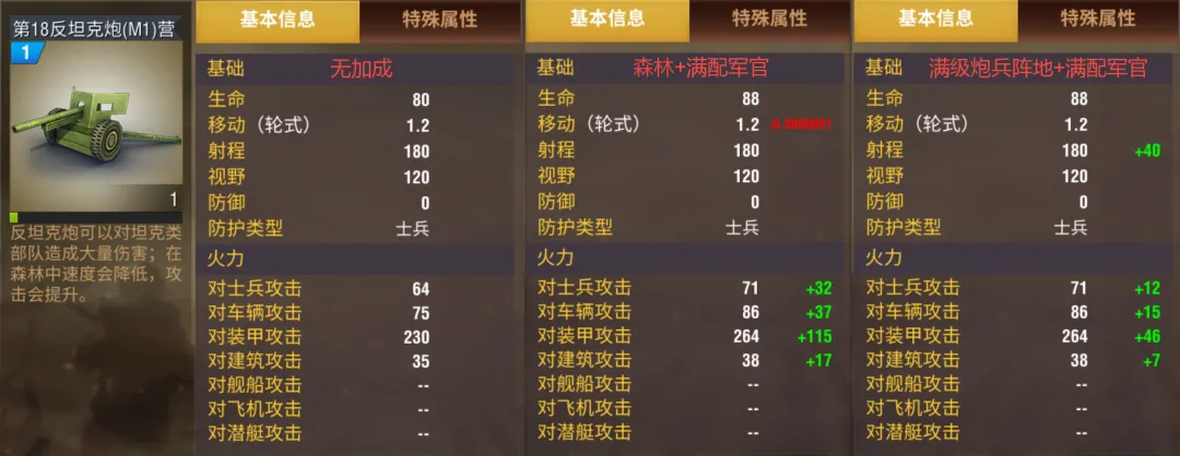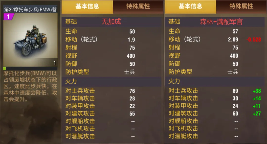 PS:军官加成会直接计算在 白色 属性数值内,战场内临时获得的加成会以 绿色 属性数值呈现。