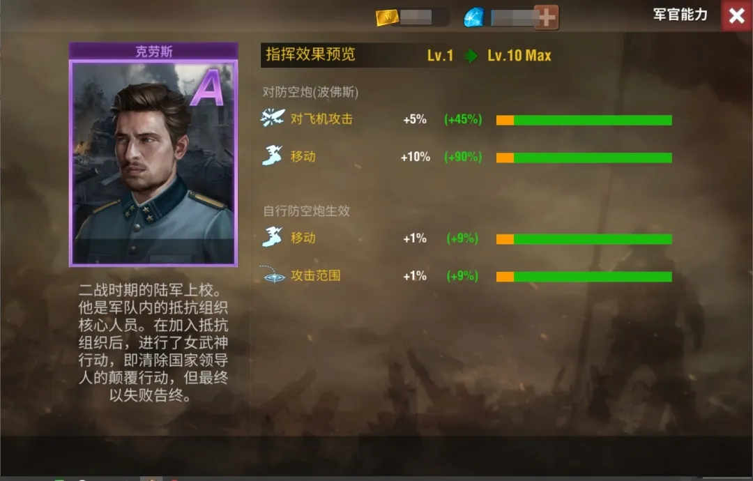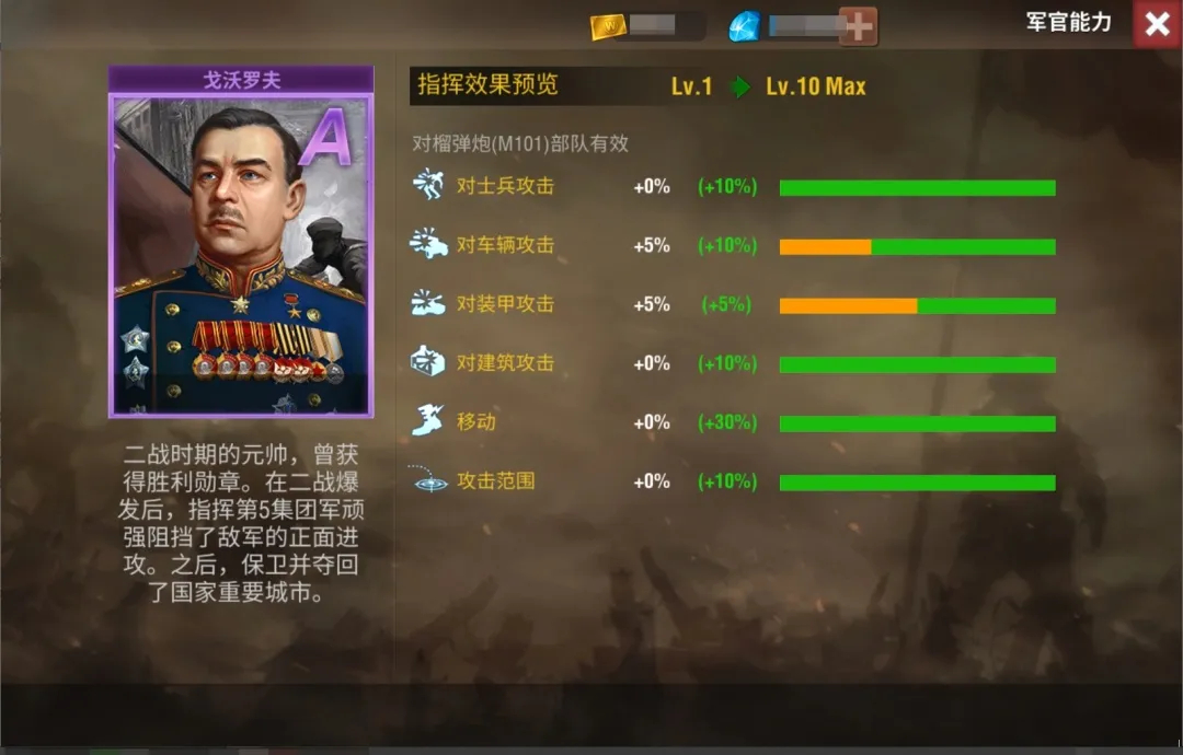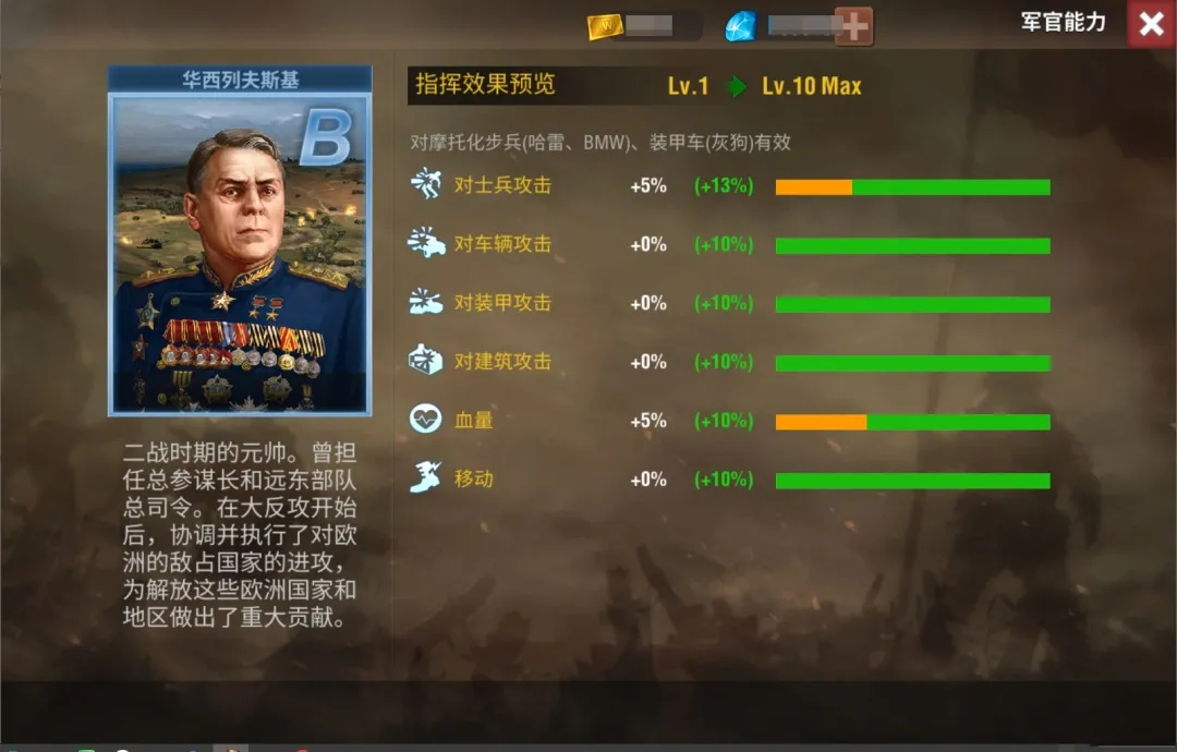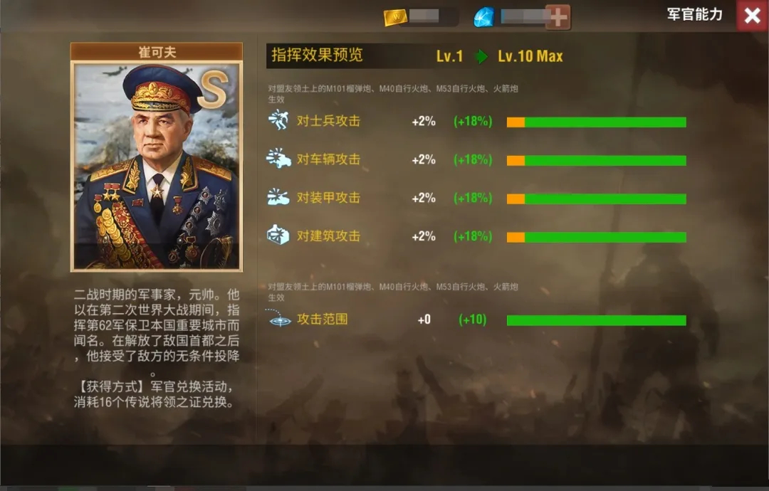 PS:军官加成会直接计算在 白色 属性数值内,战场内临时获得的加成会以 绿色 属性数值呈现。