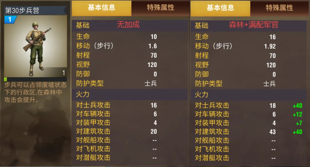 一起看看步兵站在森林中且在自己领地内,并佩戴满级军官吃满加成的效果。