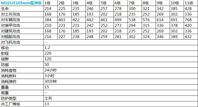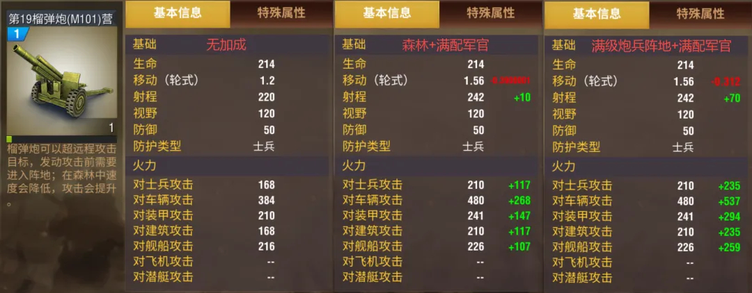 其中M101式105mm榴弹炮还会额外获得 攻击+20% 射程+20