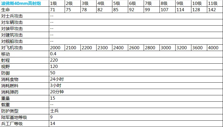 波佛斯40mm高射炮是用来克制空军部队的,因为他的防御低,移速慢,机动性差。且攻击前需要一定的准备时间,所以他不适合主动出击寻找敌方,更适合用于在已知敌方有空军部队的情况下,提前在自己领土内布置做防御准备。虽然波佛斯40mm高射炮也属于炮兵,但它是不能配合炮兵阵地使用。