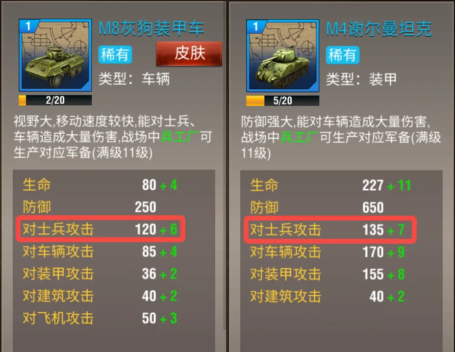 士兵类型的劣势是防御较低,其他兵种都可以对士兵造成不俗的伤害,前中期灰狗装甲车、M4谢尔曼坦克等,都可以针对步兵类型输出较高的伤害。