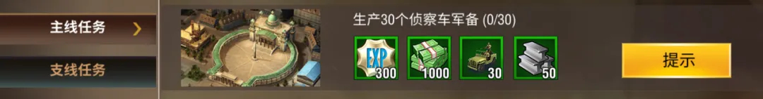 另外,支线任务也常常被新手玩家忽略,其实支线任务可以提供很多资源。比如类似支线任务“生产100个侦查车军备”,如果您觉得您不需要这么多侦查车,或者因为支线任务卡住资源升级城市了,也可以在生产并组建完成后,于基地内遣散部队,同时又领取到了支线任务提供的奖励,让新手前期资源不多时也可以做到“速10”。