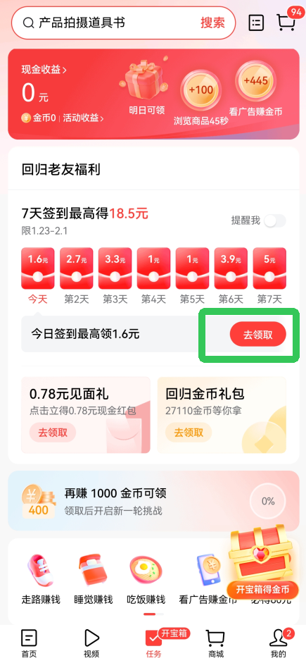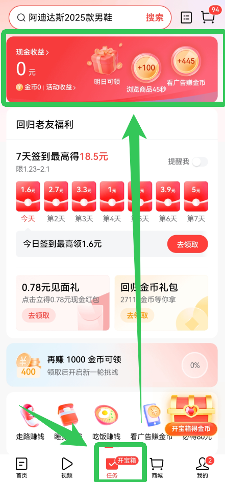 2、点击【任务】,再点击上方红色区域的【现金收益】。