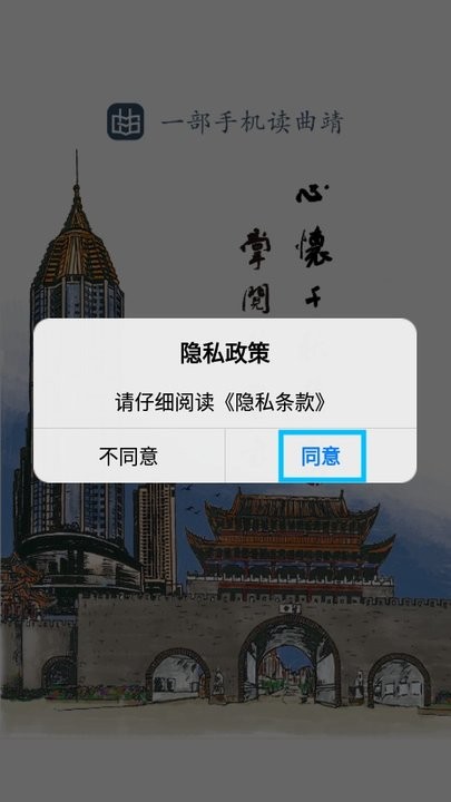 下载并打开“读曲靖”软件,阅读弹出的隐私政策,点击【同意】按钮;