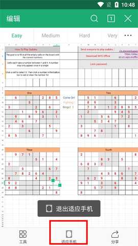 3、在做表格之前我们先看看怎么查看表格,先点击“适应手机”,这样使用起来会方便很多,上面easy、medium、hard,这些是页码,都是可以进行更改的;