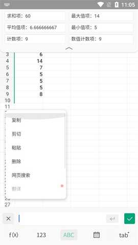 7、最后,当我们输入单元格之后,选中全部可以进行复制、剪切、显示求和等功能;