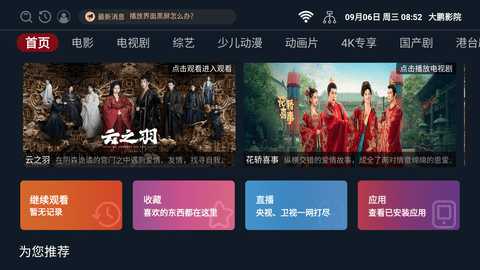 1、下载并安装大鹏影院电视版,打开应用后,看到首页展示的热门影视资源。