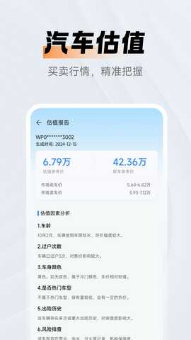 车辆估值:用户输入车辆信息后,系统将生成详细的估值报告,帮助用户评估车辆的市场价值。