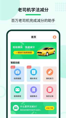 老司机学法减分是一款专为驾驶员设计的辅助学习工具,通过多样化的功能帮助用户高效掌握学法减分相关知识,提升学习和备考的效率。软件集成了拍照搜题、模拟考试等实用功能,帮助驾驶员顺利通过学法减分考试,确保他们在学习过程中能够更轻松地获取所需信息,提升考试通过率。